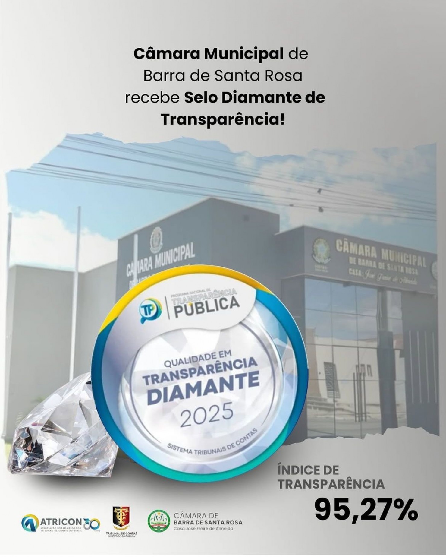 A Câmara Municipal de Barra de Santa Rosa conquistou o Selo DIAMANTE do Programa Nacional de Transparência Pública da ATRICON, atingindo 95,27% no índice de conformidade nos critérios avaliados.